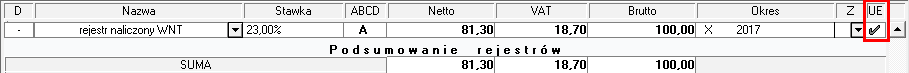 Dodawanie osobnych rejestrów nie jest konieczne, ale ułatwia bieżącą kontrolę poprawności rozliczeń podatku. Dlatego można w dowolnej ilości zdefiniować kolejne rejestry, z takimi samymi parametrami, jak te predefiniowane. Dodatkowo, aby WDT i WNT zostało prawidłowo wykazane na deklaracjach VAT-7 oraz VAT-UE, w definicji dokumentów włączona jest zawsze opcja Pokaż kolumnę UE (dzięki temu, podczas rejestracji danych w rejestrze VAT, można oznaczyć rejestry znacznikiem UE). ![]()